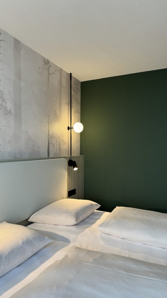 Inspired by the green yet central location along the Mittelland Canal, the interior combines soft shades of green with warm wooden accents.
